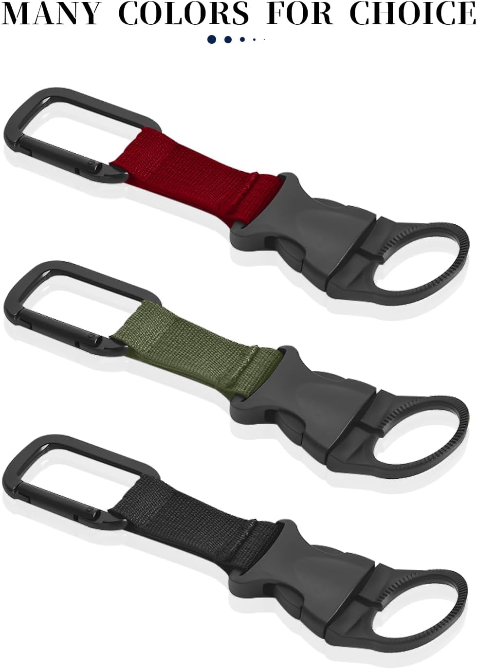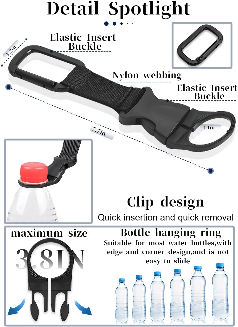 Easy to use: The plastic buckle and ring make it easy to attach and detach your water bottle from the clip, and the inner diameter of the ring can accommodate different bottle sizes. Simply pull open the ring and snap the clip in place.